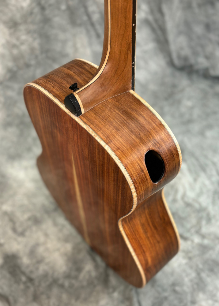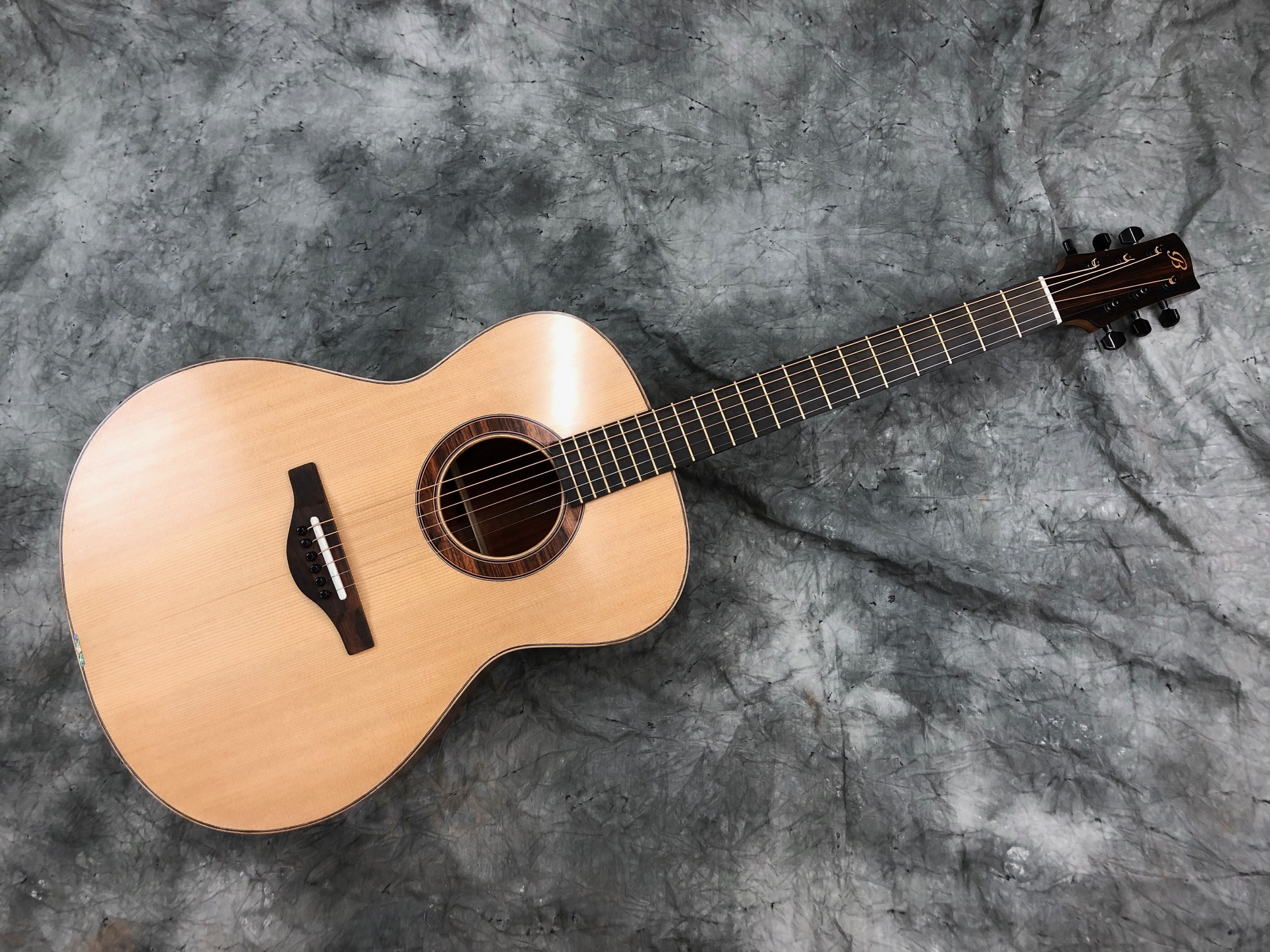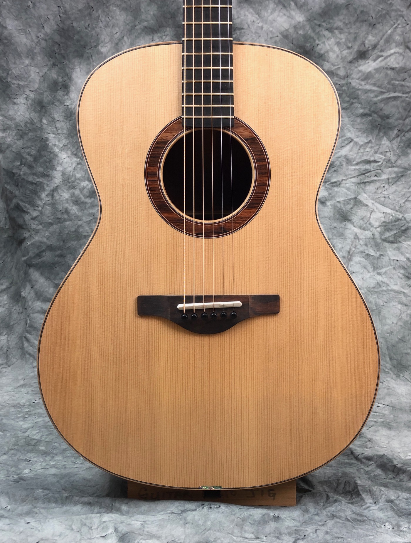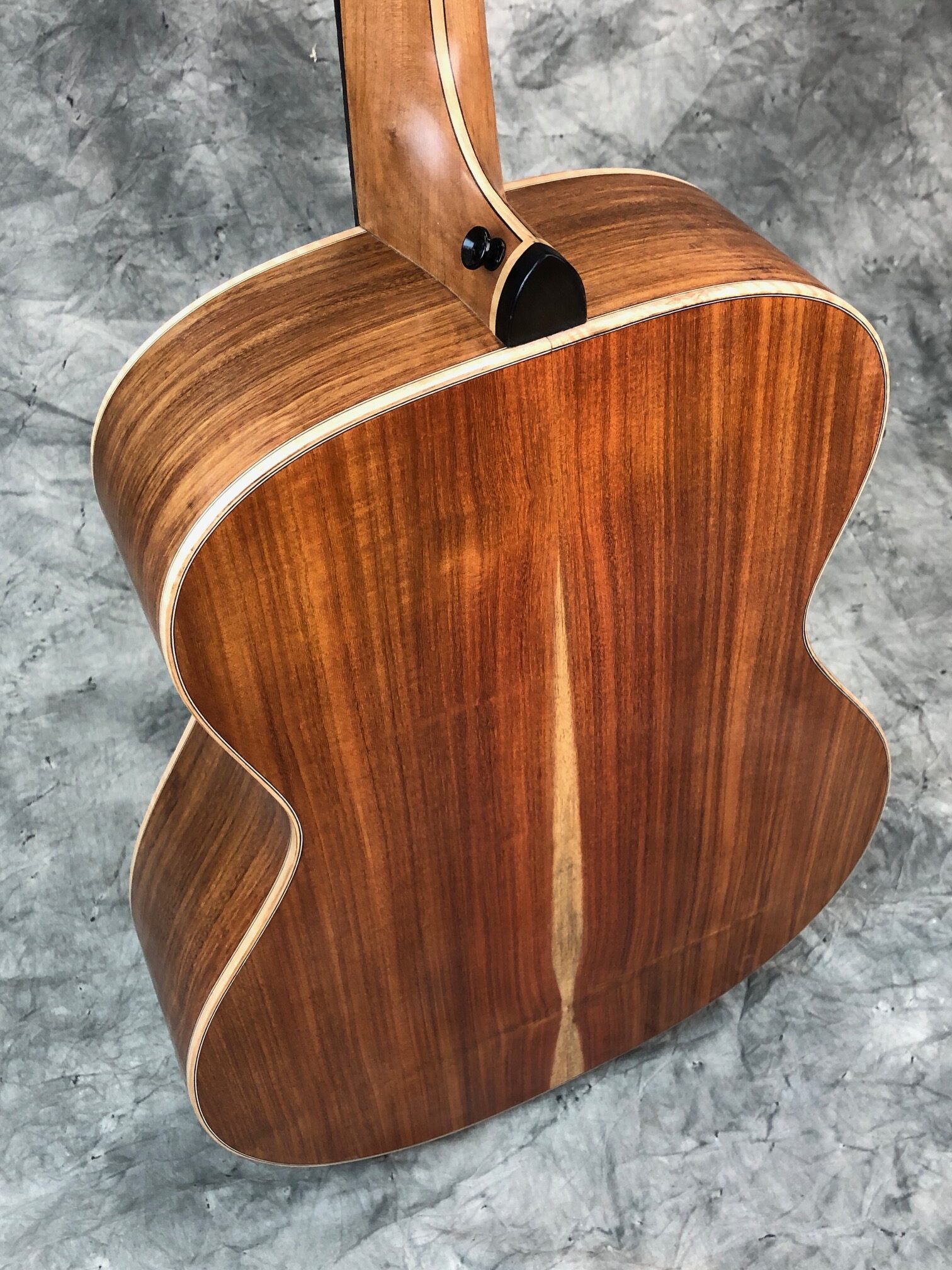This mid sized guitar is ideal for finger style players. The body is made of Granadillo, known as the wood that sings! This guitar just rings!